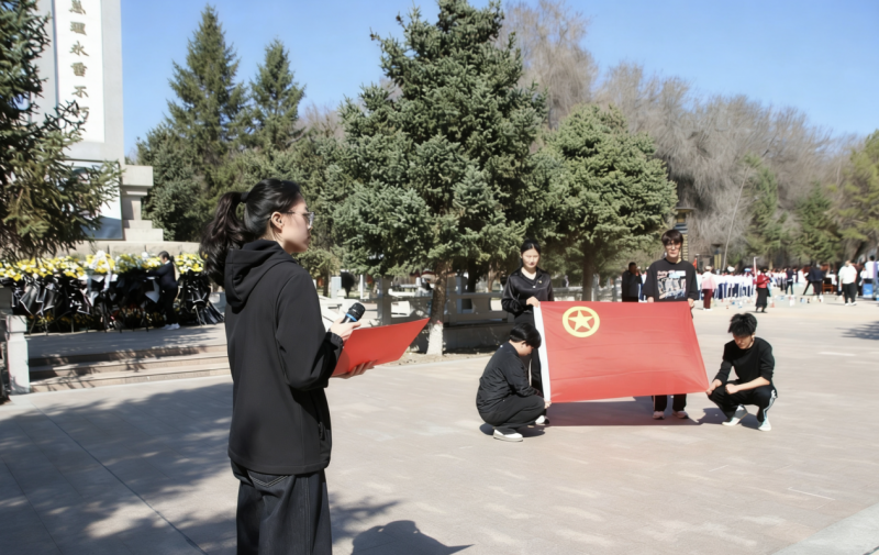 全体成员身着深色服装、佩戴团徽,在周恩来总理纪念碑前整齐列队,现场气氛庄严肃穆。团员们垂首肃立一分钟,深切缅怀周总理的丰功伟绩与崇高风范。优秀团员代表巴合疆致追思词,号召大家以总理为楷模,勇担时代责任。团支书任娜羽带领全体团员重温入团誓词,铿锵誓言彰显了青年一代不忘初心、砥砺前行的坚定信念。